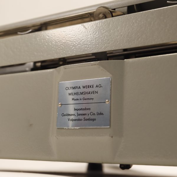 Fabricada en 1961 en Wilhelmshaven, Alemania Occidental, por Olympia Werke AG. Importada a Chile por Goldmann, Janssen y Cia. Ltda., Valparaiso-Santiago.