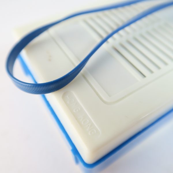 De plástico, colores azul, blanco y plateado metálico. Parlante 8 ohm – 0,5 W