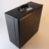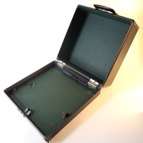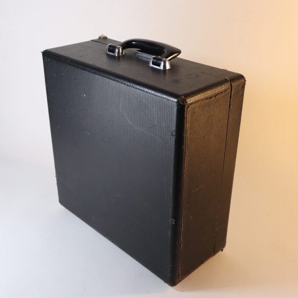 Funcionando y con maletín original de madera, forrado en tela negra texturizada, con manilla de baquelita y cierre funcionando. Limpieza y mantención reciente. Incluye cinta GR9 bicolor negra/roja nueva, en sus carretes originales de metal Smith-Corona.