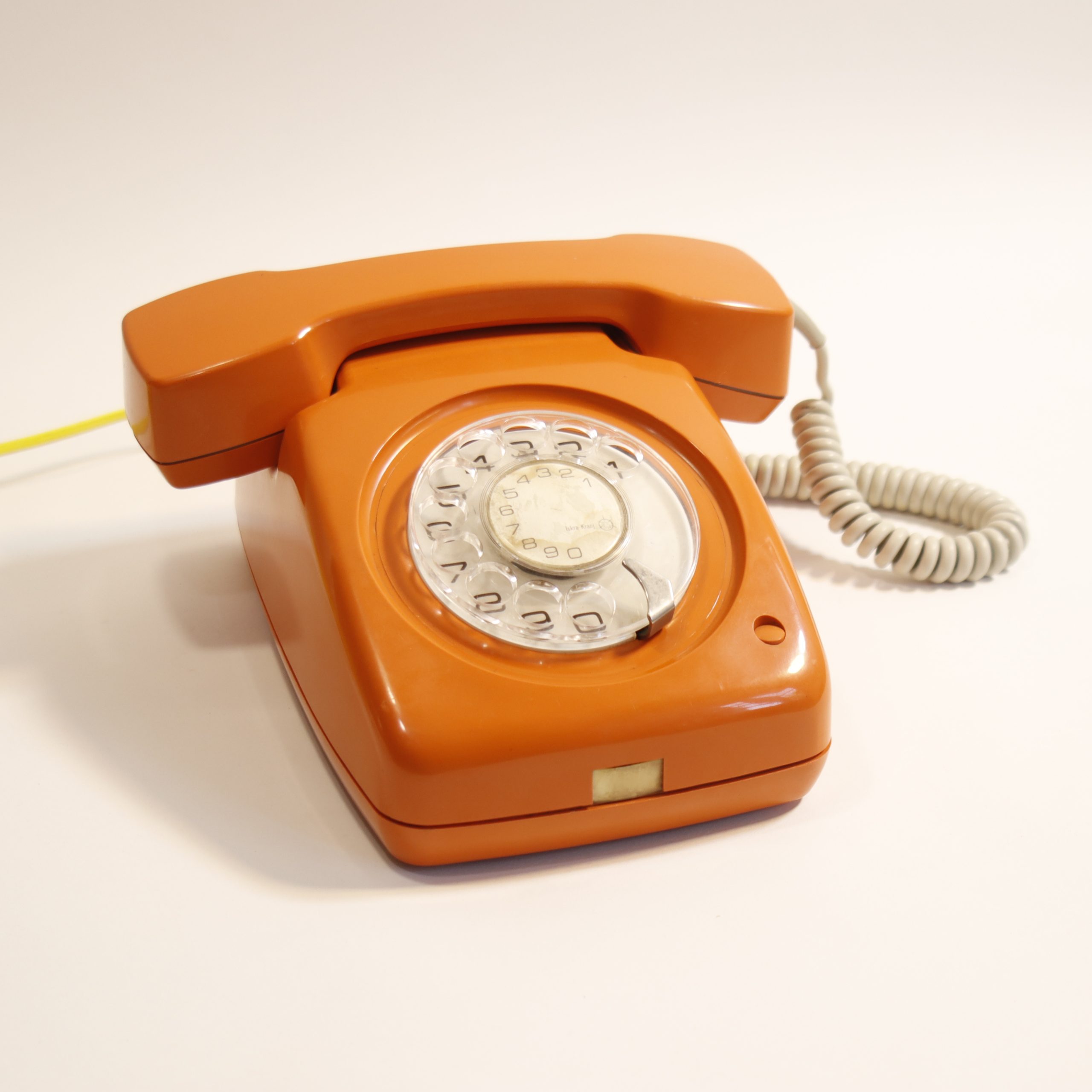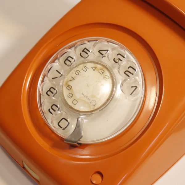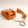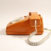 El aparato está funcionando y listo para conectar y hablar, manteniendo su uso práctico mientras funciona como pieza de colección. Ideal para escritorio, estudio o sala, dialoga entre la estética de la telefonía de los 70 y la presencia cromática del naranjo industrial.