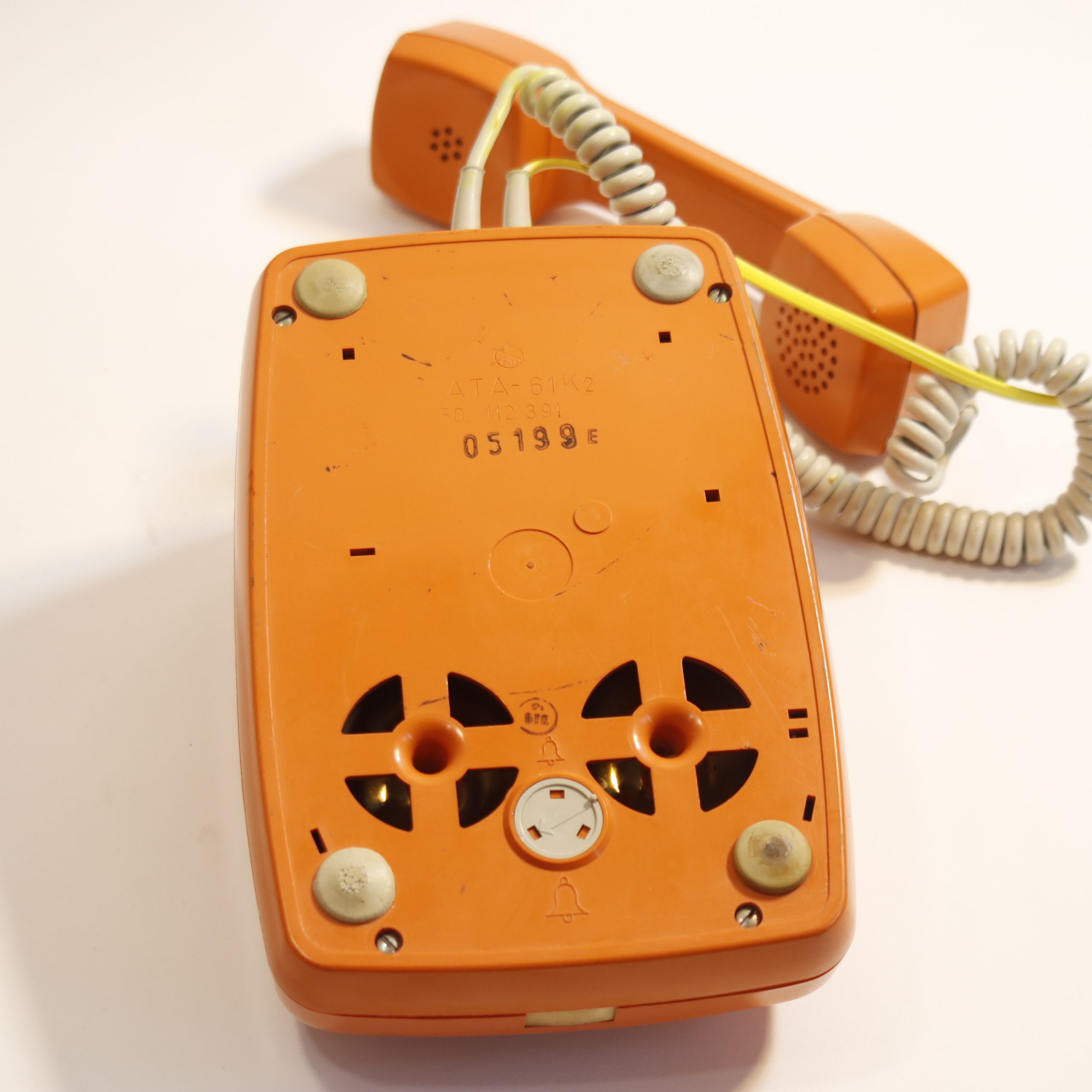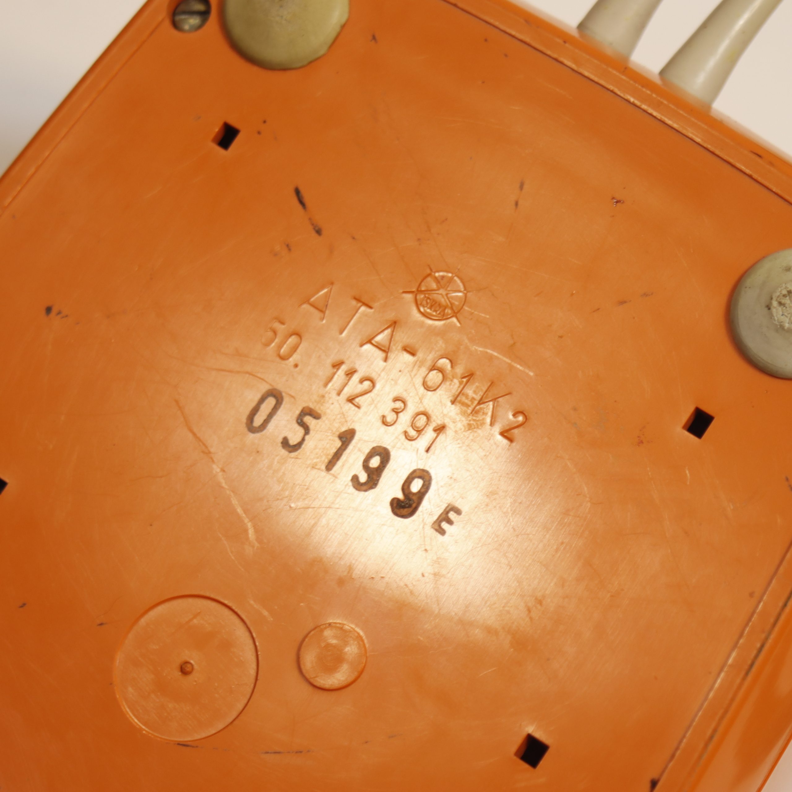 Este teléfono de sobremesa ATA‑61 fue fabricado en la antigua Yugoslavia por la empresa ISKRA (Eslovenia) en la década de 1970, con carcasa de plástico naranjo y disco giratorio integrado. Su diseño es sencillo y volumétrico, sin grandes detalles ornamentales, pensado para uso doméstico y de oficina, con un tacto firme y un sonido clásico propio de la telefonía analógica.