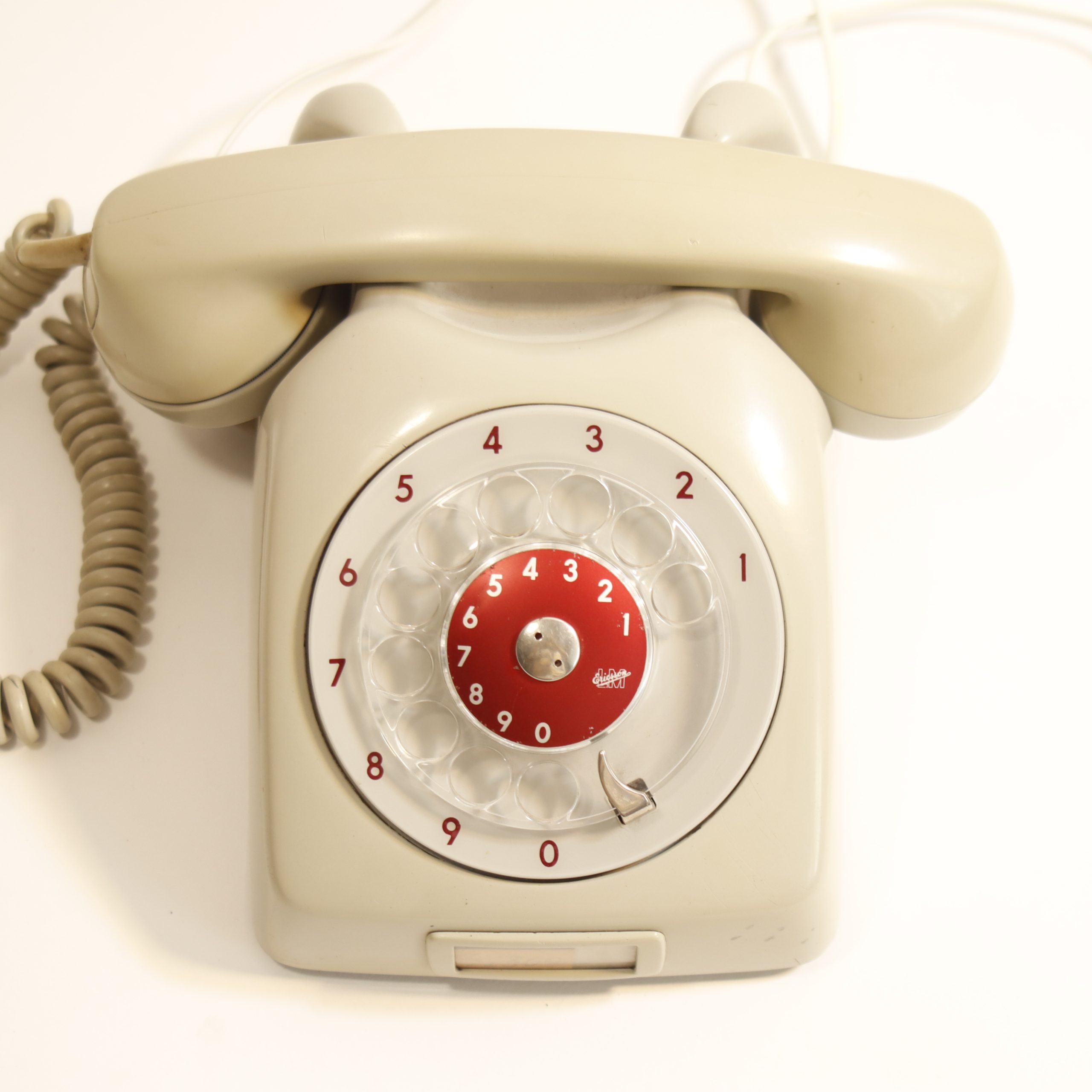 Fabricado por LM Ericsson en Suecia, este modelo pertenece a la tradición de telecomunicaciones escandinavas: diseño limpio, construcción robusta y pensado para uso doméstico u oficinas. El disco giratorio funciona de forma clásica, con un tacto firme y un sonido propio de la telefonía analógica.